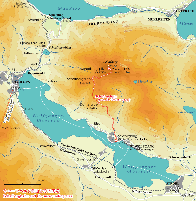 22:シャーフベルク鉄道は、ザルツカンマーグートの景勝地、標高1782mのシャーフベルク山 Schafberg に上るアプト式ラック鉄道。所要片道35分、山頂からは周辺の三つの湖が一望になる。起点は巡礼の町ザンクト・ヴォルフガング St. Wolfgang で、湖上航路にも接続している。石炭焚きの旧型蒸機に代わり、現在の主役は石油火力の新型蒸機で、繁忙期にはディーゼル機関車も加わる。軌間1000mm、最急勾配255‰。 オーストリアのラック鉄道-シャーフベルク鉄道